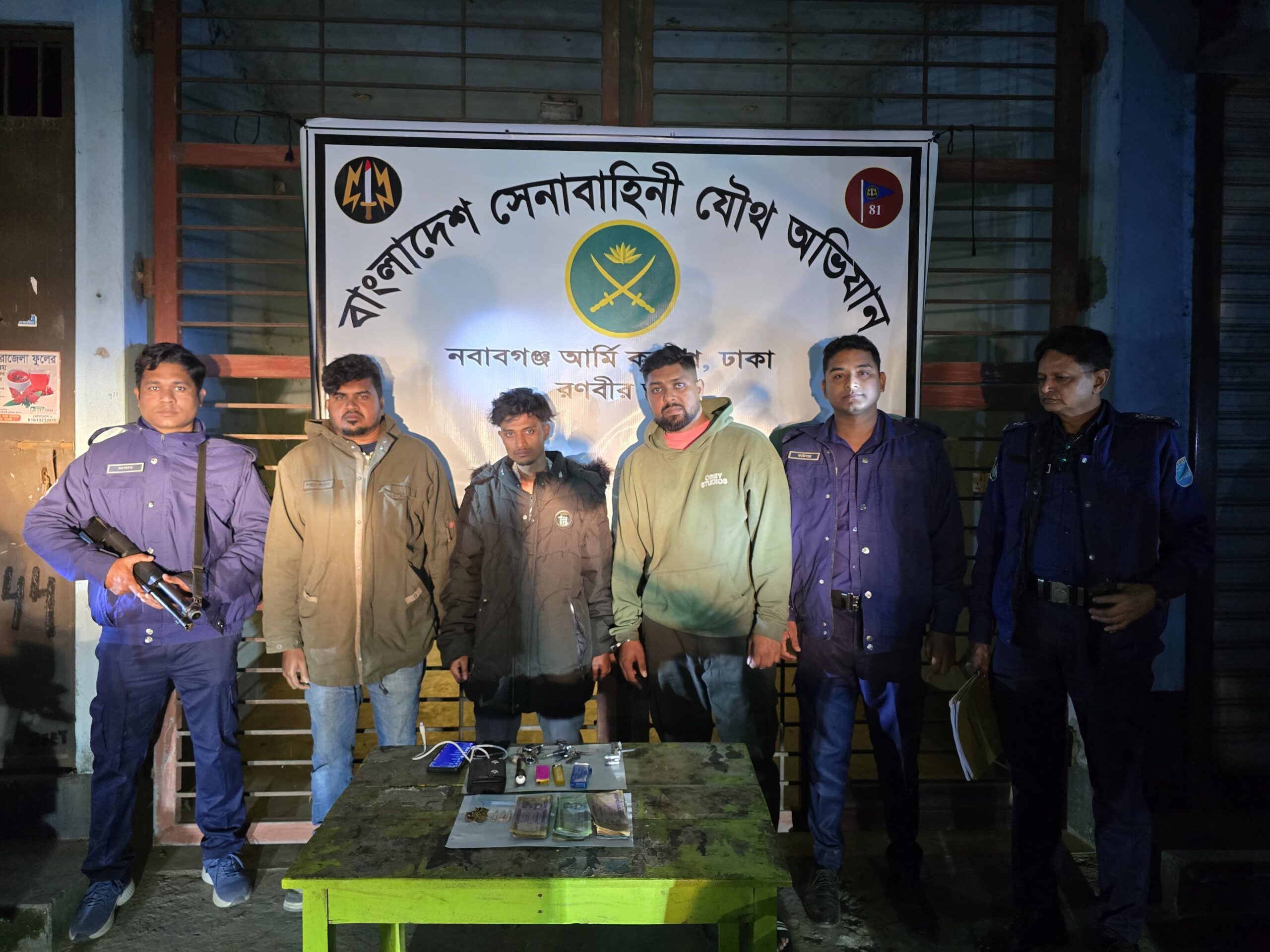 আটককৃতদের মধ্যে একজনকে মাদকাসক্ত অবস্থায় পাওয়া যায়। উক্ত রেস্তোরাঁ এলাকায় নিয়মিত ইয়াবা সরবরাহকারী মাদক ব্যবসায়ী নাজমুল সেনা টহল দলকে দেখে পার্শ্ববর্তী বাড়িতে পলায়ন করে গেট বন্ধ করে দেয়। পরে সেনা টহল দল নবাবগঞ্জ থানার পুলিশের সহায়তায় মাদক ব্যবসায়ী নাজমুলকে আটকের চেষ্টায় বাড়িটি তল্লাশি করা হয়। তল্লাশিকালে পুলিশ উক্ত মাদক ব্যবসায়ীকে তার বাসা থেকে আটক করে এবং তার কাছ থেকে মাদক বিক্রির সর্বমোট ৩৮,৩২০ টাকা উদ্ধার করে।পরবর্তীতে আটককৃত ব্যক্তিদের নবাবগঞ্জ থানা পুলিশের কাছে জব্দকৃত মালামালসহ পরবর্তী আইনানুগ কার্যক্রমের জন্য হস্তান্তর করে।
