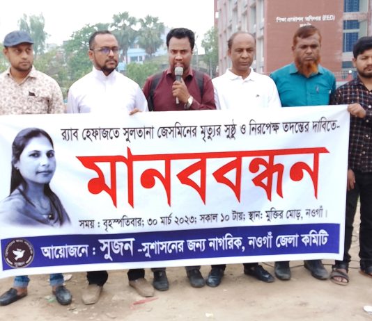 নওগাঁয় র্যাব হেফাজতে নারীর মৃত্যু, সুষ্ঠু ও নিরপেক্ষ তদন্তের দাবীতে সুজনের মানববন্ধন